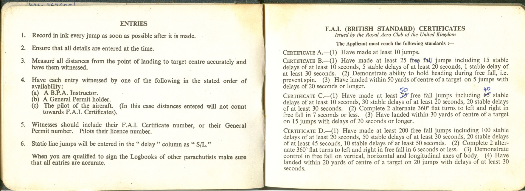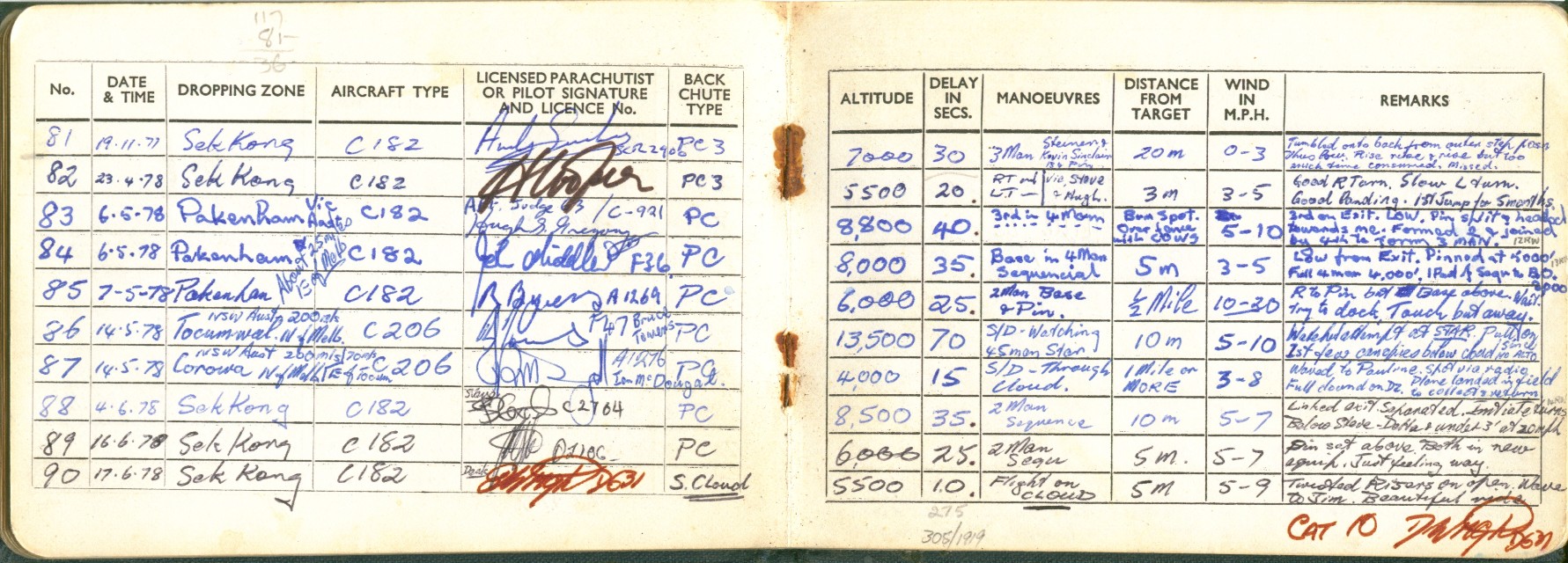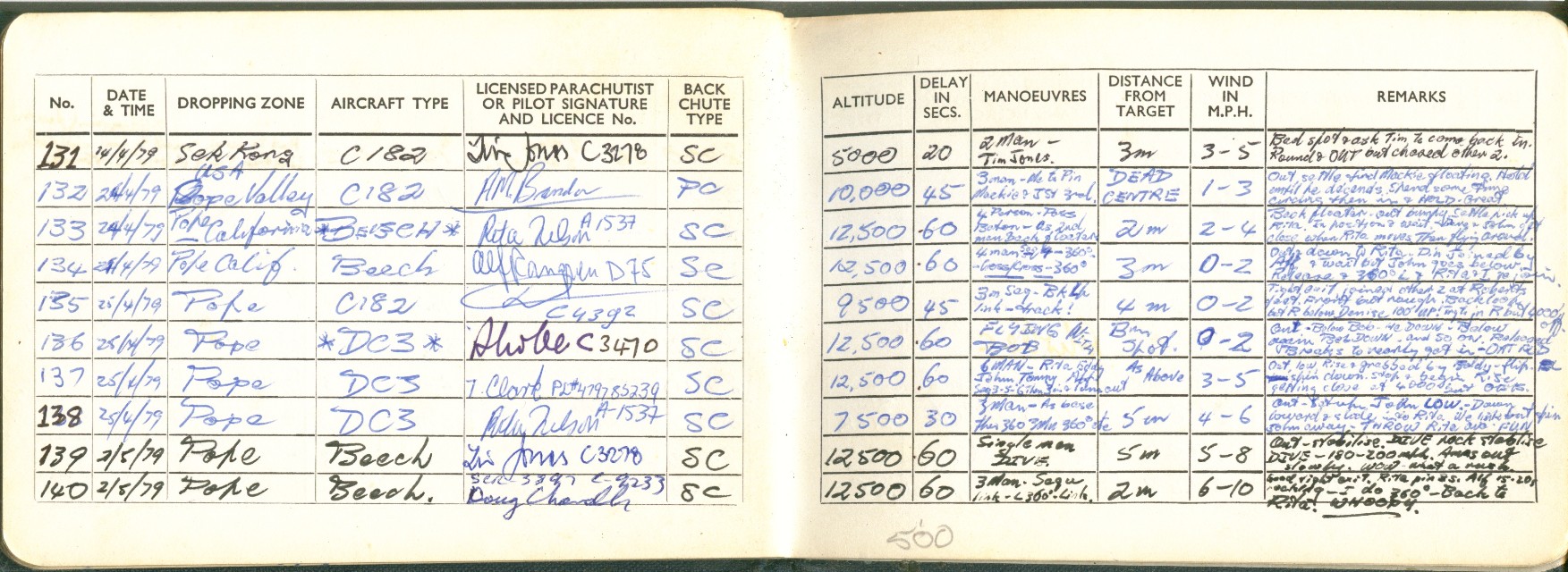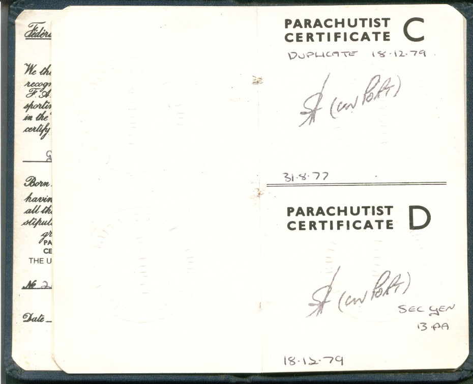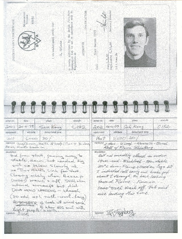 I took to this, like a duck to water ;=)) I went far enough to become an instructor, so I could teach other people this fantastic sport ... Below is a scan of my BPA certificate, and many pages from the first log book ... first 200 jumps ... and just some b/w scans out of my next book ... this show 338 jumps ... I guess I did a total of 350-360 ... before I moved onto other sports ...