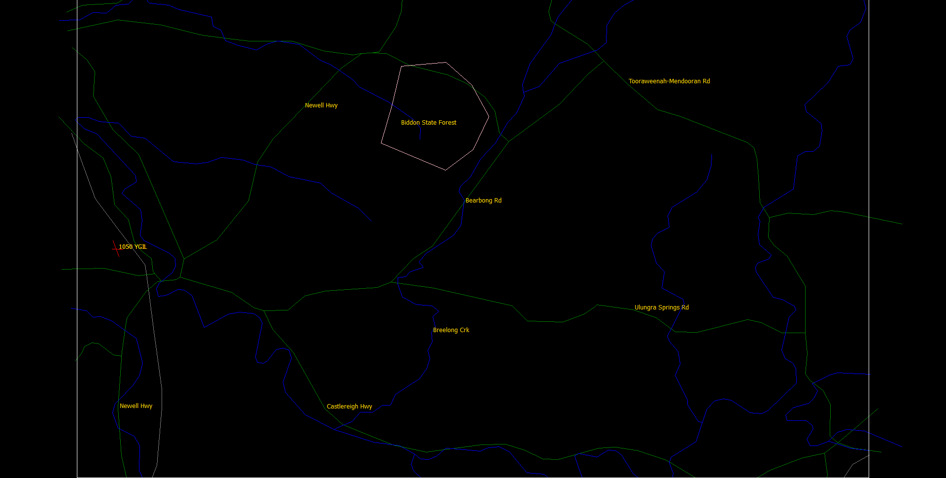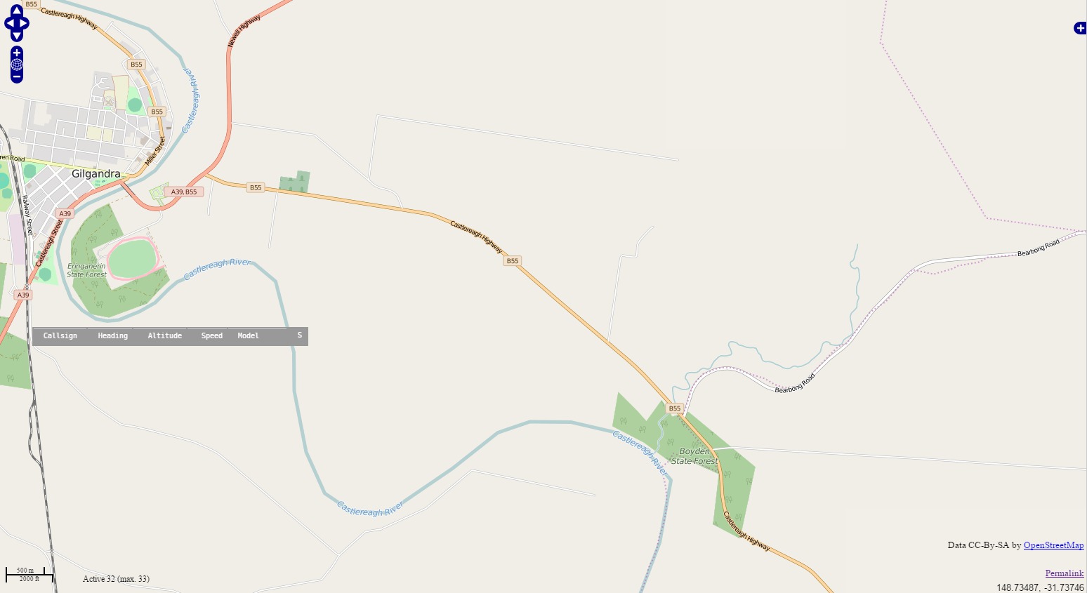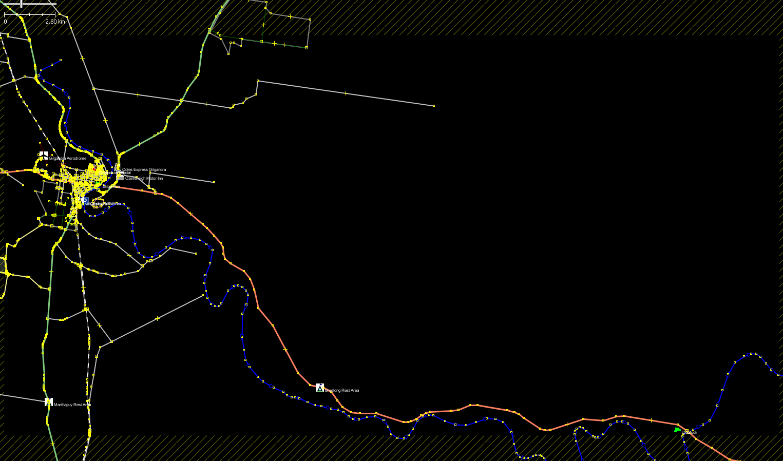 An extract of the road, river, rails and forest data from VMAP0 to a xgraph formatted file, and displayed by Qt polyView2D. Again we can see the Bearbong Road. Click to see the full 1920x970 in a new window. It is quite a long roads from where it branches from the Castlereigh Hwy, beside the Boyden State Forest, just before the Back Creek Rd turnoff (not shown in this view), all the way to the Tooraweenah(-Mendooran) Rd, near the Dilly State Forest. If I remember correctly it is paved for about 2/3 of its length, until about the Flora Reserve Rd turnoff. The other important road shown in this view is the Ulungra Springs Rd, off to the right, crossing the Breelong Creek, headed off to Apple Tree Flats, and also onwards to also meet the Tooraweenah Rd.
