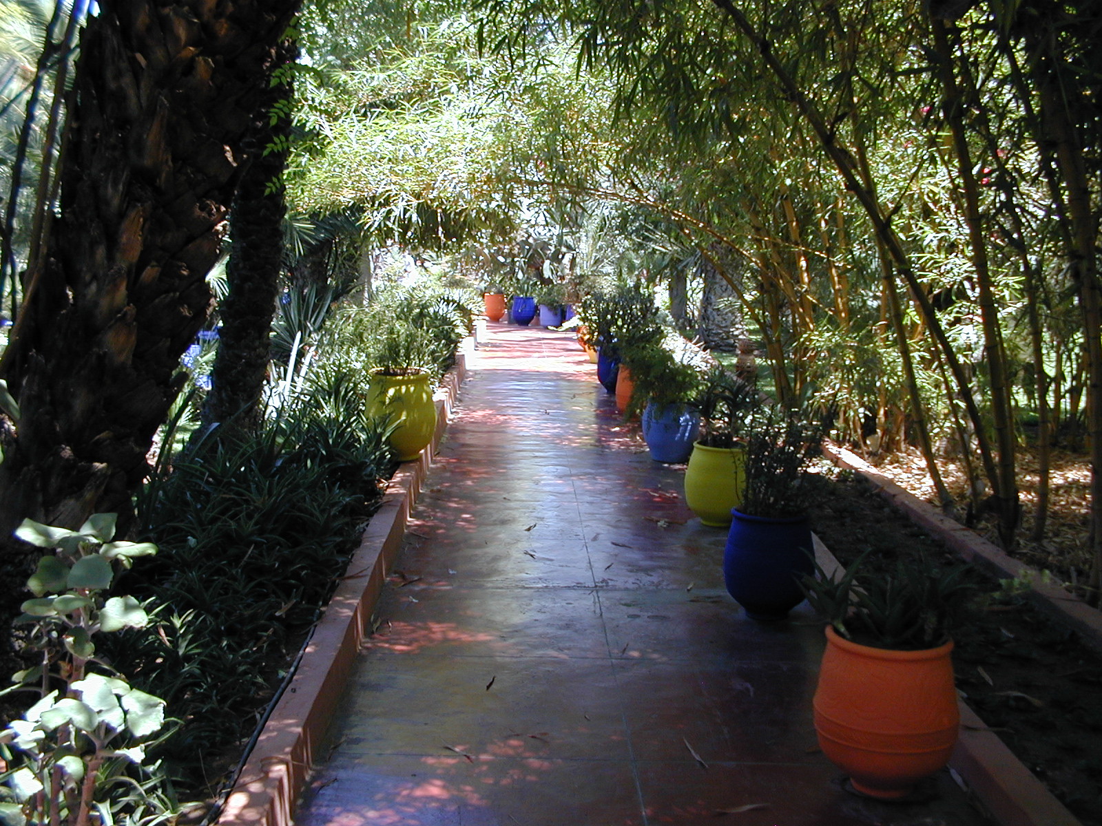 Slide #290: Marrakech - Majorelle Gardens - colorful pots on walkway.